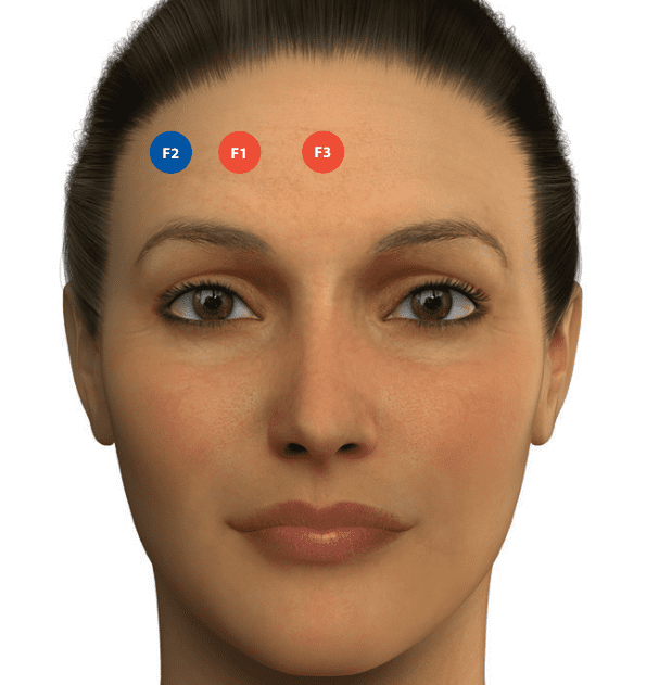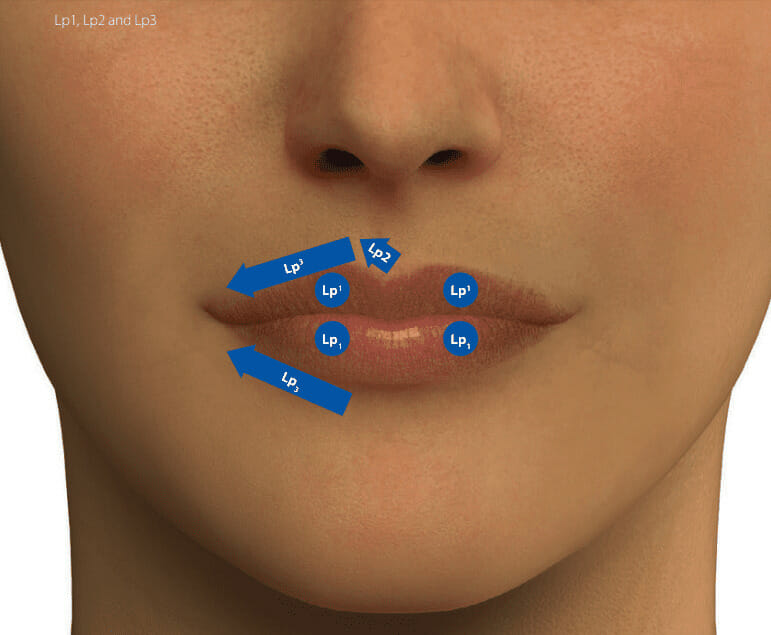 When "coding", Dr. de Maio divided the face into 13 areas and a total of 75 sub-segments, which ultimately resulted in 75 MD Codes™. In addition to the facial area, these codes also contain information on the complexity and technique of the treatment: Red codes stand for areas that should only be performed by experienced physicians, while other areas are even expressly advised against injections. The more MD Codes™ a treatment contains, the more complex it is. For example, for a treatment on the forehead, the 3-point forehead reshape (see image below,) can be read: "F" stands for forehead, the numbers 1,2 and 3 refer to the affected sub-segments of the forehead, the color red indicates an "alert area" (special care should be taken) and the round shape indicates a specific technical design. In comparison, the 8-point lip reshape (lip treatment) is also relatively complex, but in a different way: It has only one red code, but there are seven blue codes and several different technical designs.
